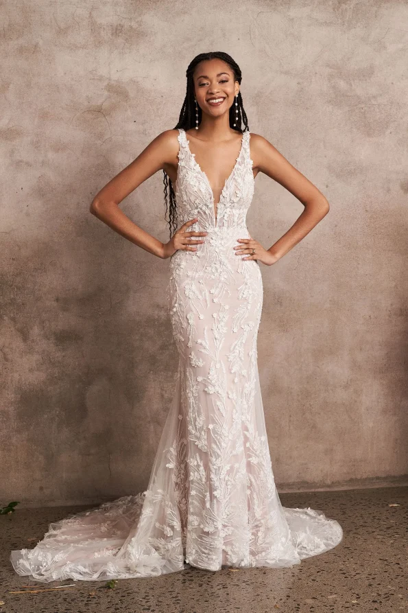 66212 is a 3D lace and beaded fit and flare with a beautiful plunge neckline and thick straps for a secure feeling. Our sample is a size 12 and is in good condition. Dry cleaning recommened.