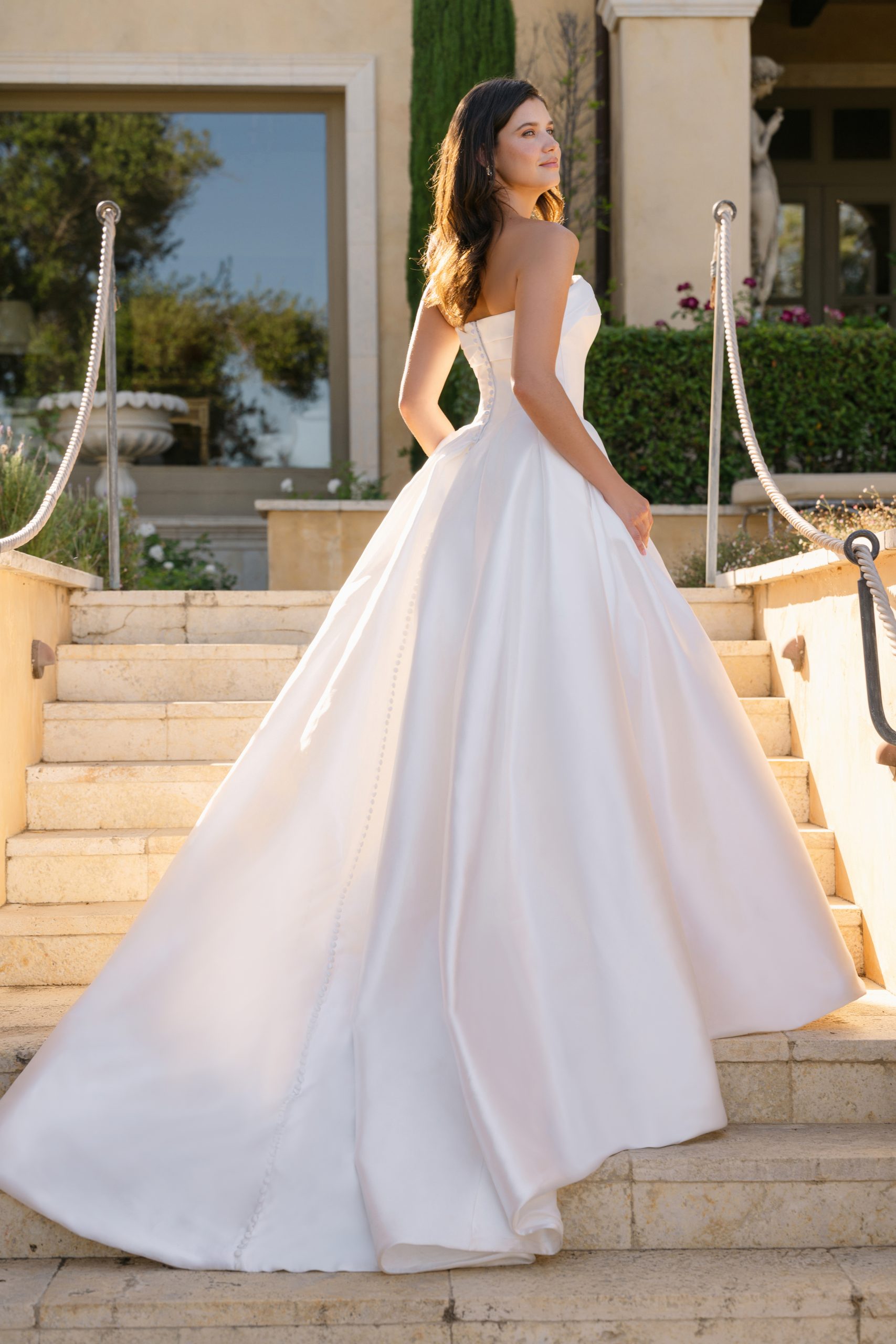 Designed for the bride who believes in true love, this gown blends simplicity with grandeur. The smooth satin finish feels like silk against the skin, while the full skirt creates a breathtaking silhouette that’s both classic and unforgettable. Whether walking down a grand aisle or dancing beneath the stars, this gown moves with a whisper of forever.