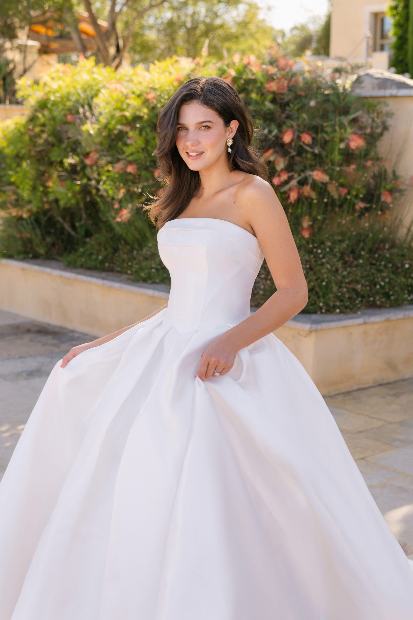 Radiating timeless romance, this strapless satin ball gown is the essence of modern fairytale beauty. The sculpted bodice gently shapes the figure, highlighting the waist before cascading into a voluminous, flowing skirt that glides with every step. Crafted from luminous satin, it captures the light with a soft, dreamlike glow — elegant, graceful, and effortlessly enchanting.