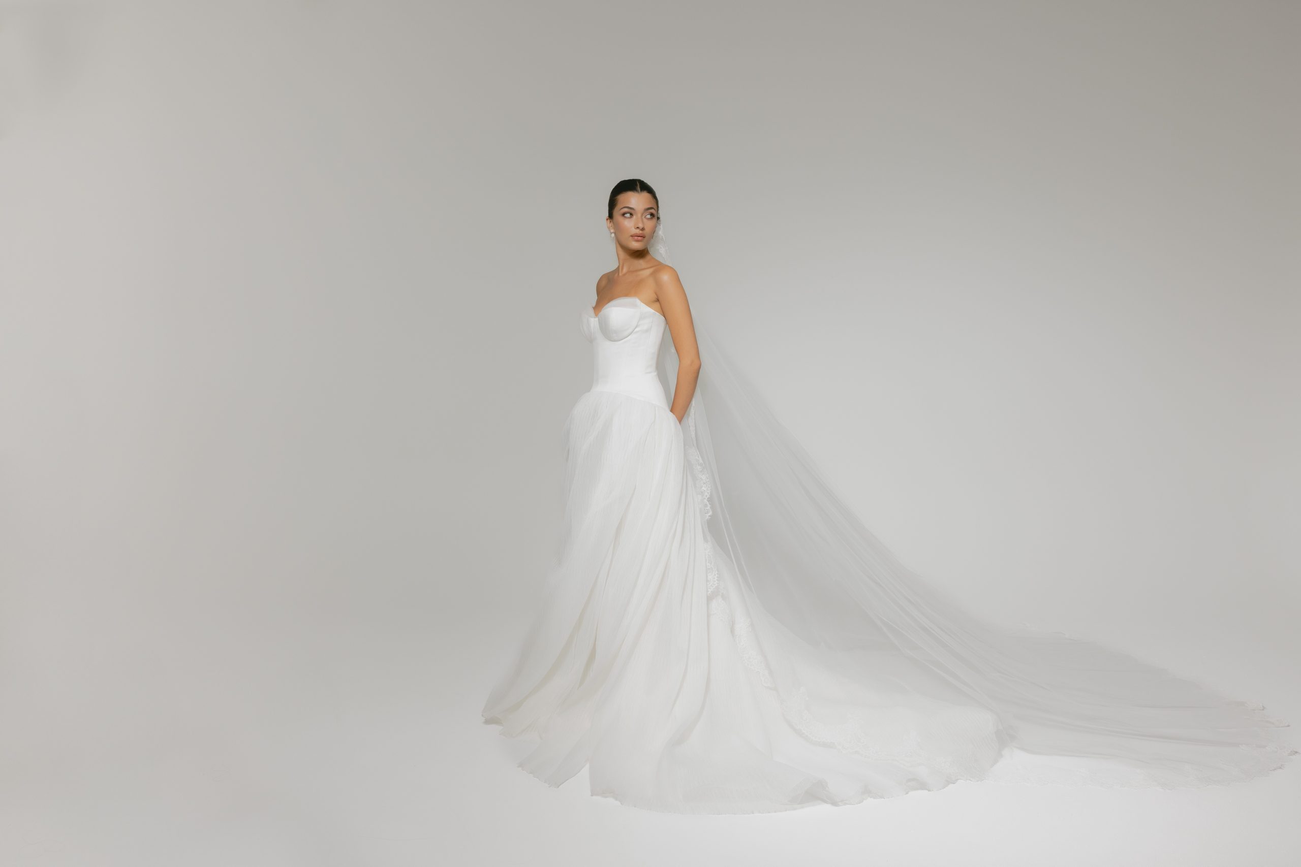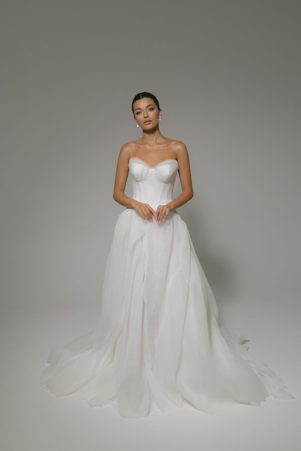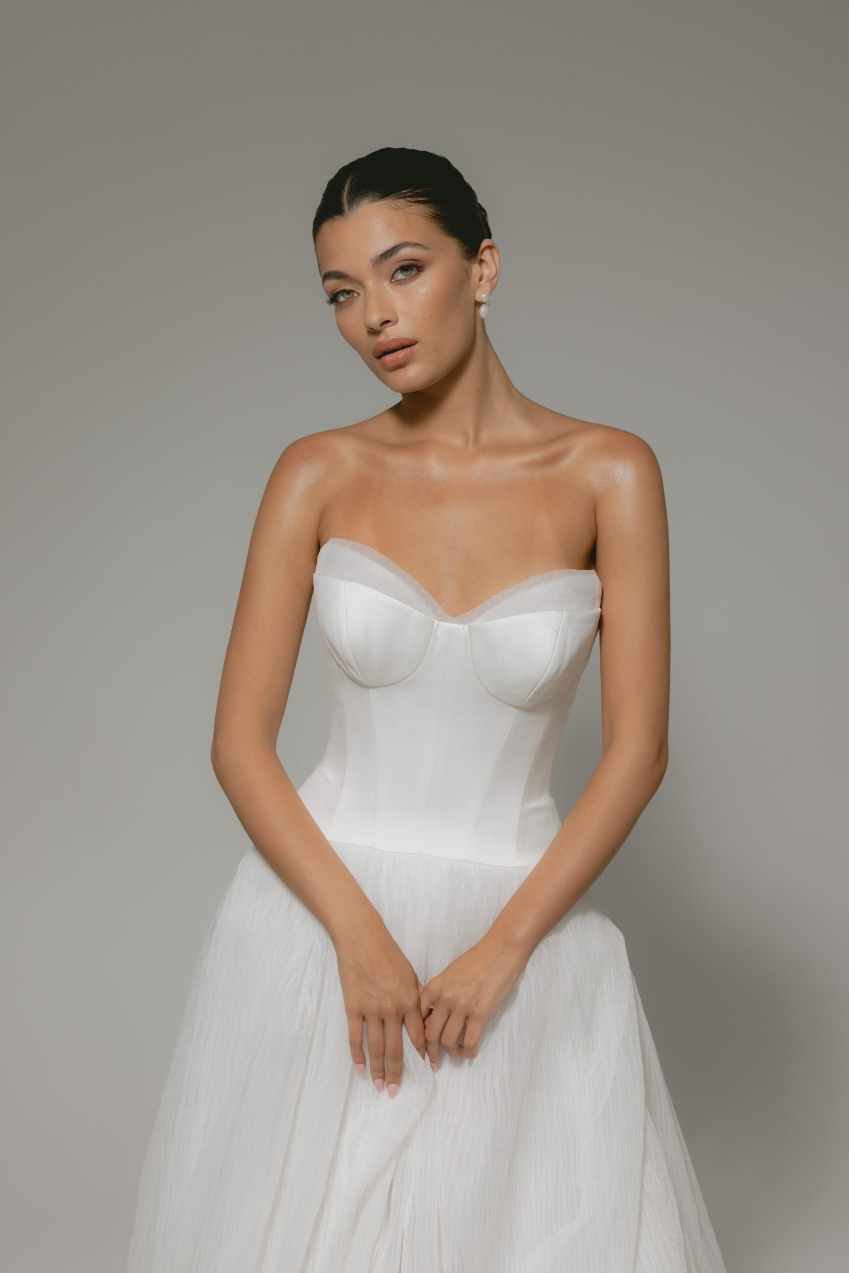 The Cassia wedding dress embodies soft romance and timeless femininity. Designed with a structured sweetheart bodice and sculpted cups, this gown beautifully flatters the décolletage while cinching the waist for a graceful silhouette. The bodice flows effortlessly into a dreamy A-line skirt, crafted from layers of delicate soft tulle that create ethereal movement with every step. The Cassia captures the essence of modern grace infused with vintage charm—perfect for the bride seeking effortless elegance on her special day.