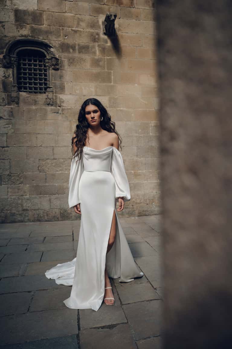 Luciana is a simple satin sheath gown with long sleeves. Our sample is in good condition. Dry cleaning is recommended.