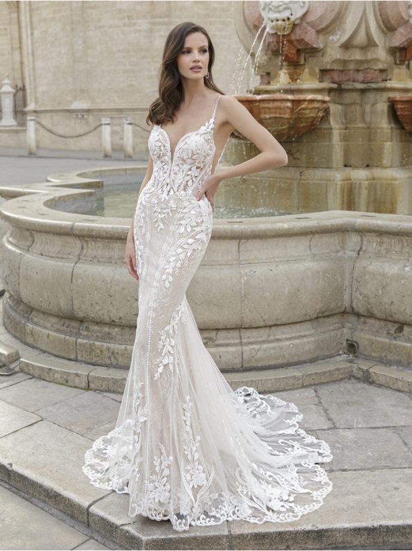 Magdala is an all over lace detailed fit and flare gown. This beautiful gown features a plunged neckline and delicate beaded spaghetti straps. Our sample is a size 12 and is in fair condition. Dry cleaning is recommended.