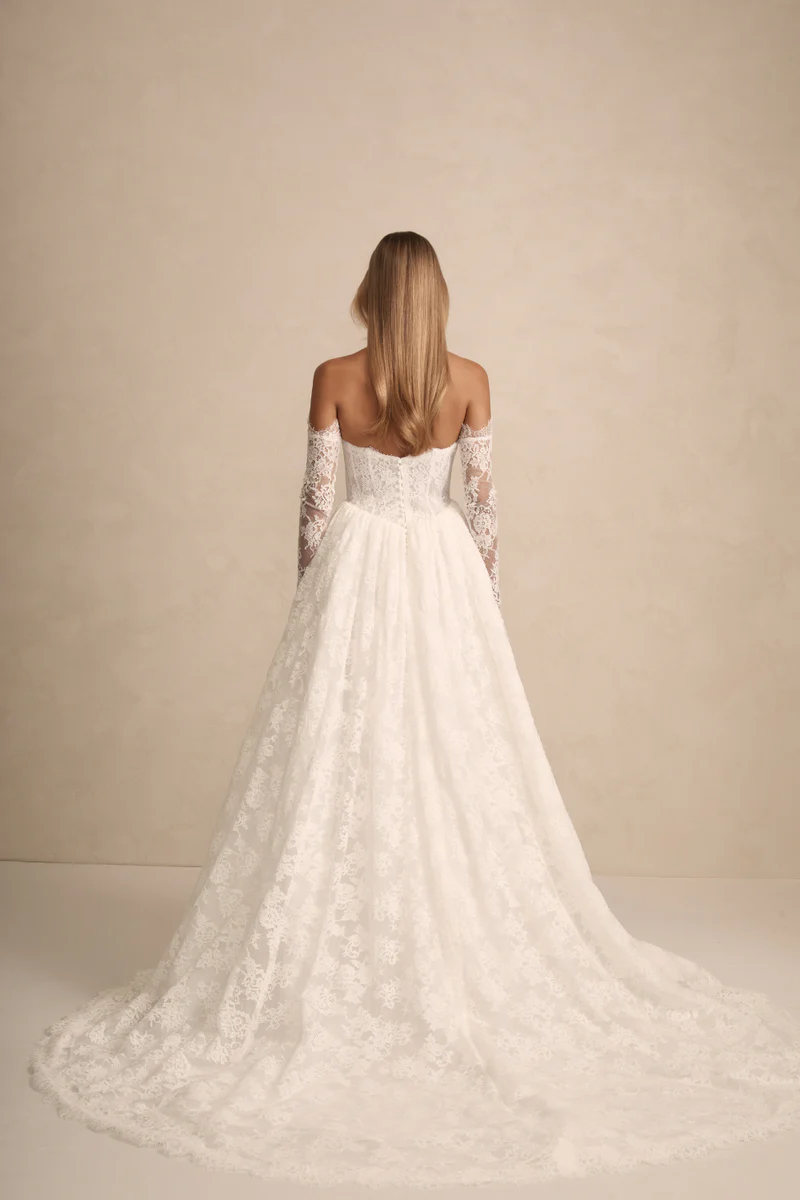 Classic, deep plunging neckline and figure-hugging skirt is hand beaded with 3D lace and an intricate Chantilly lace underlay. The daring low V back effortlessly leads to sheer train. The detachable long tulle bows are perfect for the modern, romantic bride!